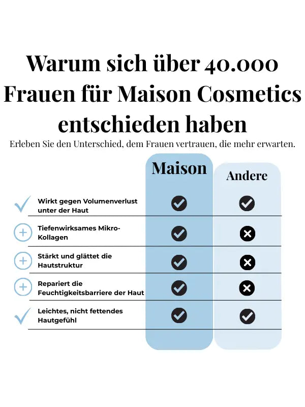 Bei Maison Cosmetics entwickeln wir Pflege, die reife Schönheit mit wissenschaftlich gestützten Formeln und einem Hauch Luxus unterstützt.